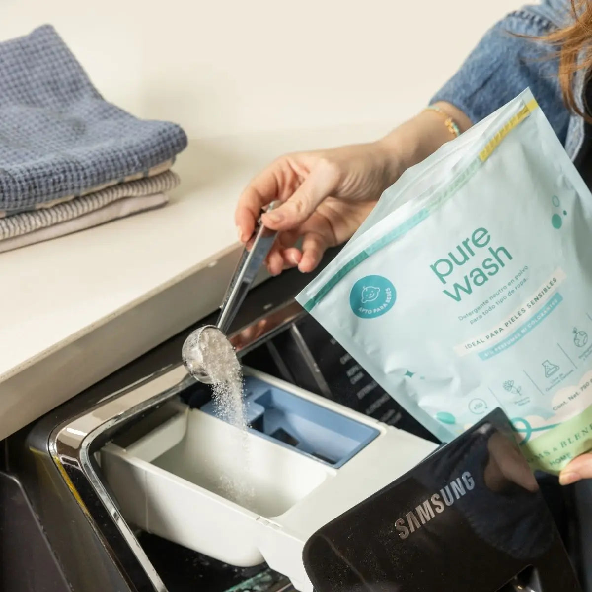 The perfect measure for using your Pure Wash detergent. Take a level scoop, empty a portion into the washing machine, and when you're done, clip it onto your bag with the clip so it's within easy reach and ready to use next time.